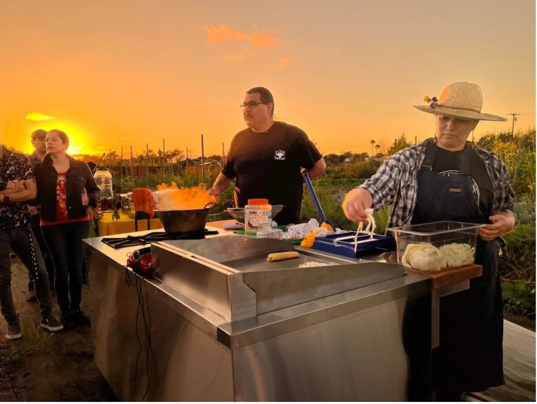 Fig. 1: POC Fungi Community organizers Mario and Cristina alongside a few community members at a huitlacoche cooking demonstration in a community farm in San Diego.